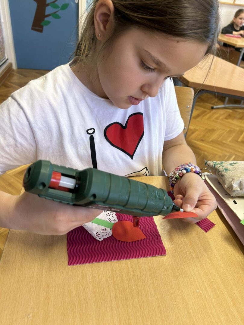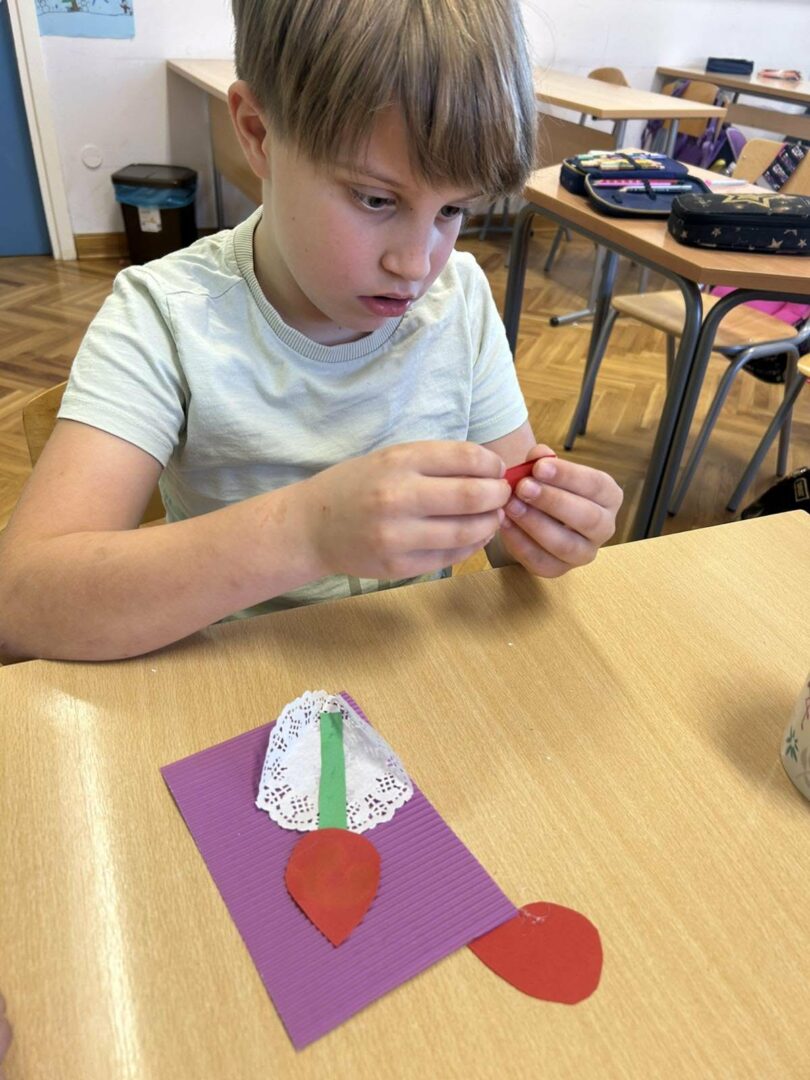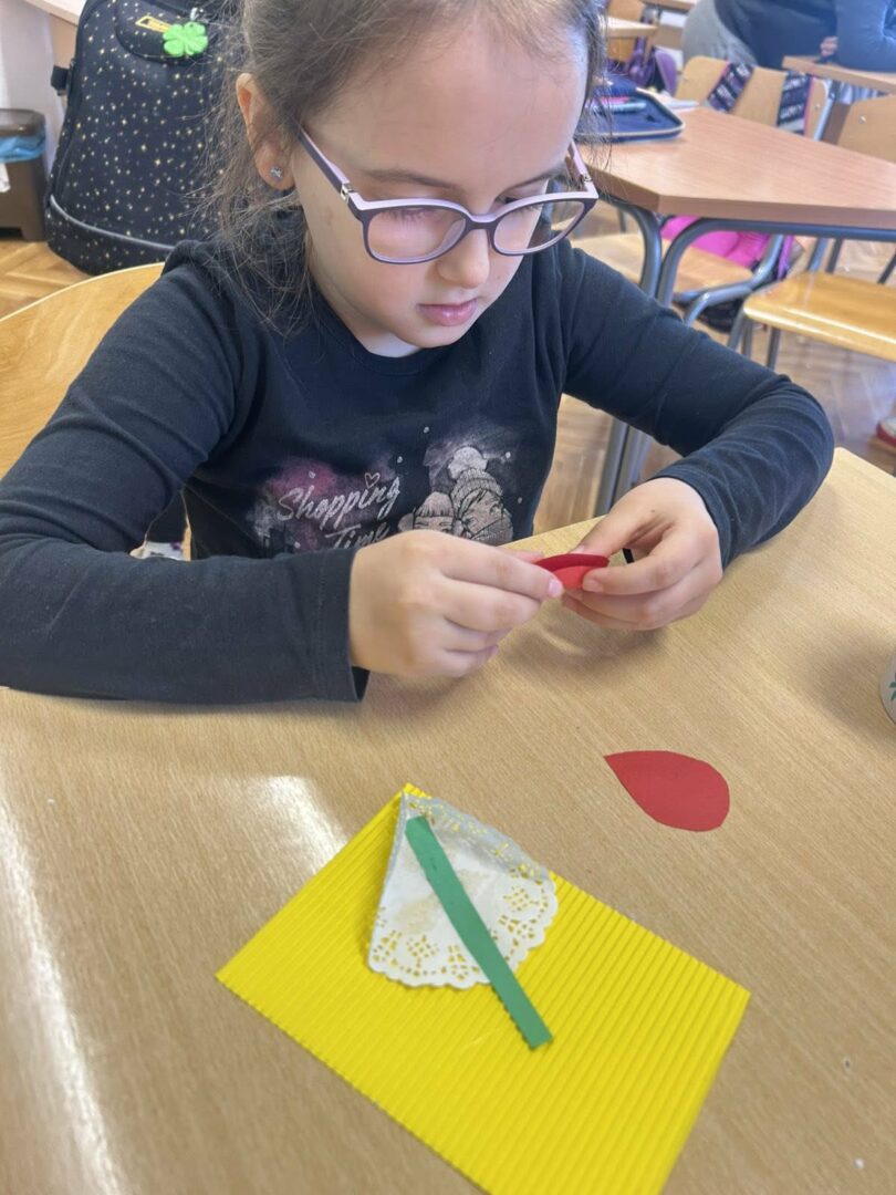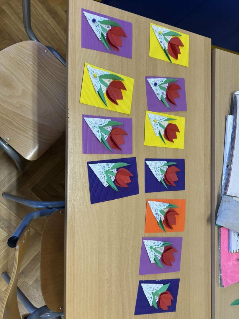 Učenici su s puno truda i mašte izrađivali cvjetove od kolaž papira koje su zatim lijepili na rebrasti papir. Svaki cvijet bio je poseban i jedinstven, baš kao i osobe kojima su čestitke namijenjene.