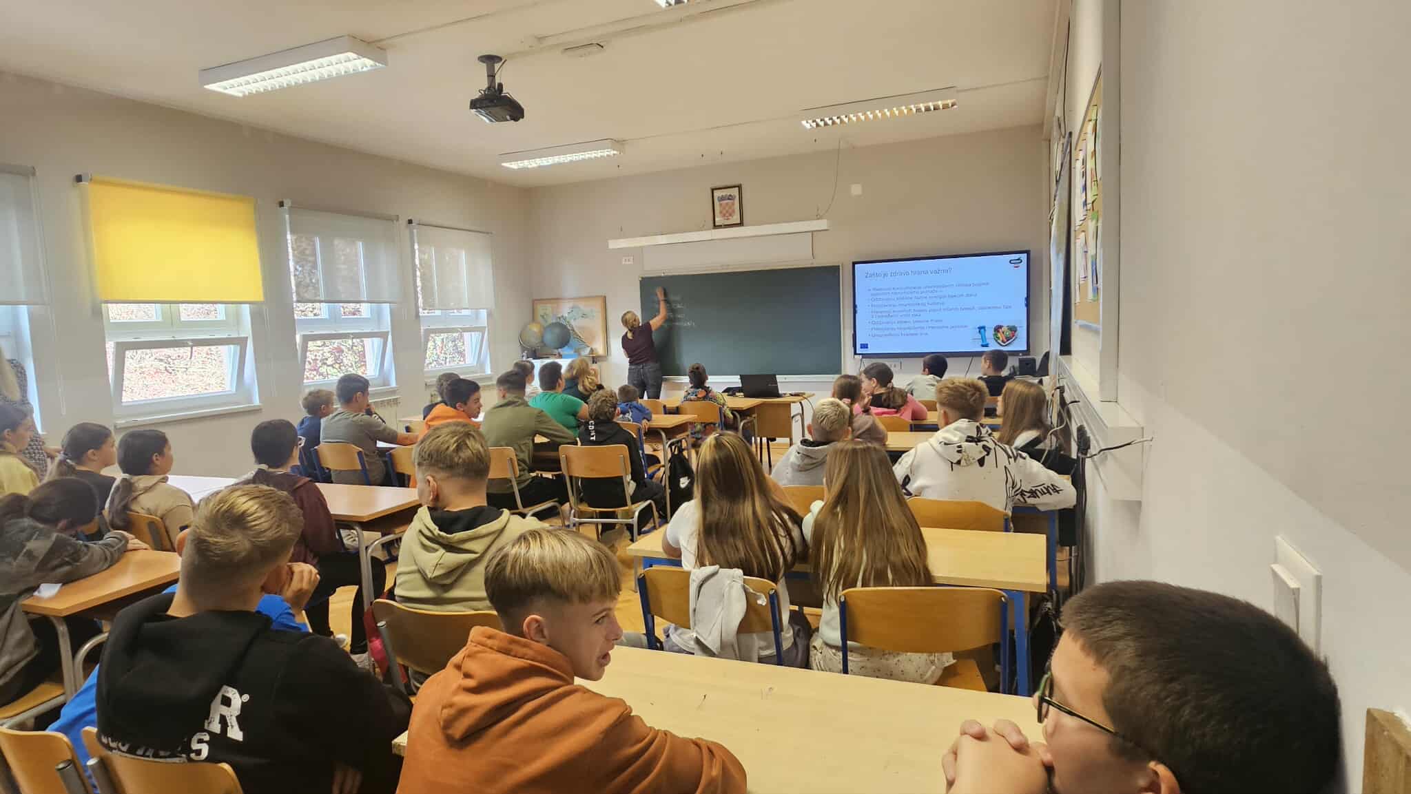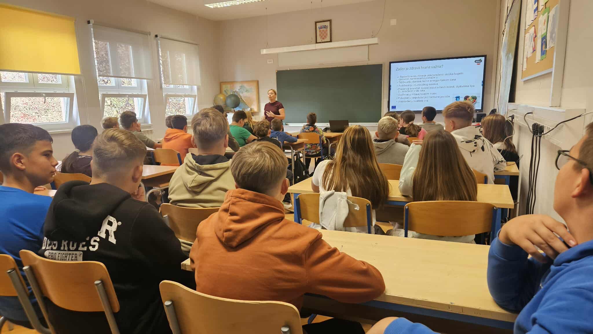 U našoj školi održana je danas edukacija pod nazivom „Zašto je zdrava hrana važna?“ za učenike predmetne nastave, koju je vodila predavačica Maja Erak, u okviru nacionalnog projekta Školska shema. Edukacija je bila interaktivna, a učenici su kroz zanimljiv razgovor s voditeljicom sudjelovali u raspravi o tome zašto je važno birati zdravu i uravnoteženu prehranu, a najaktivnijim učenicima tijekom razgovora Noli, Ani, Arisu i Damjanu uručene su  majice ili platnene torbe s logom Školske sheme.