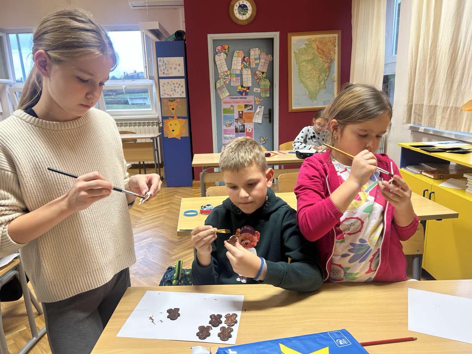 Prava blagdanska atmosfera vlada u našoj školi ovih dana. Učenici Produženog boravka sa učiteljicom Sarom Dlaka s posebnim veseljem uronili su u blagdansko stvaranje. Uz puno mašte i truda, od gline su oblikovali raznolike božićne ukrase – darove, borove, čovječuljke te razne motive. Nakon sušenja, ukrase su pažljivo obojili božićnim bojama te im dodali sjajne detalje kako bi što ljepše zasjali.